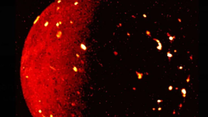 С такого расстояния видна пестрая и красочная поверхность, являющаяся результатом интенсивной вулканической активности, с сотнями кальдер и жерл на поверхности, создающих непревзойденный ландшафт. Вулканические столбы и потоки лавы окрашены во все цвета: от красного и желтого до оранжевого и черного, а некоторые потоки лавы простираются на сотни километров.